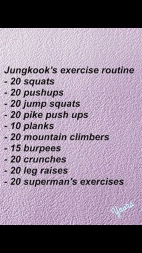 How Does Bts Workout. The list translates to 20 squats, 20 push ups, 20 jump squats, 20 shoulder exercises, 10 plank shoulder blades, 20 mountain climber, 15 burpee, 20 crunches, 20 leg raise and 20 superman exercises. After you get done with the weight routine, you can start the boxing workout.